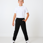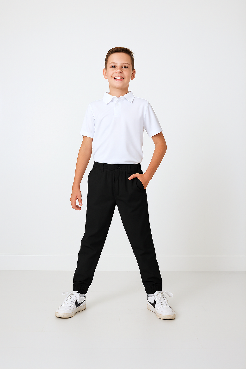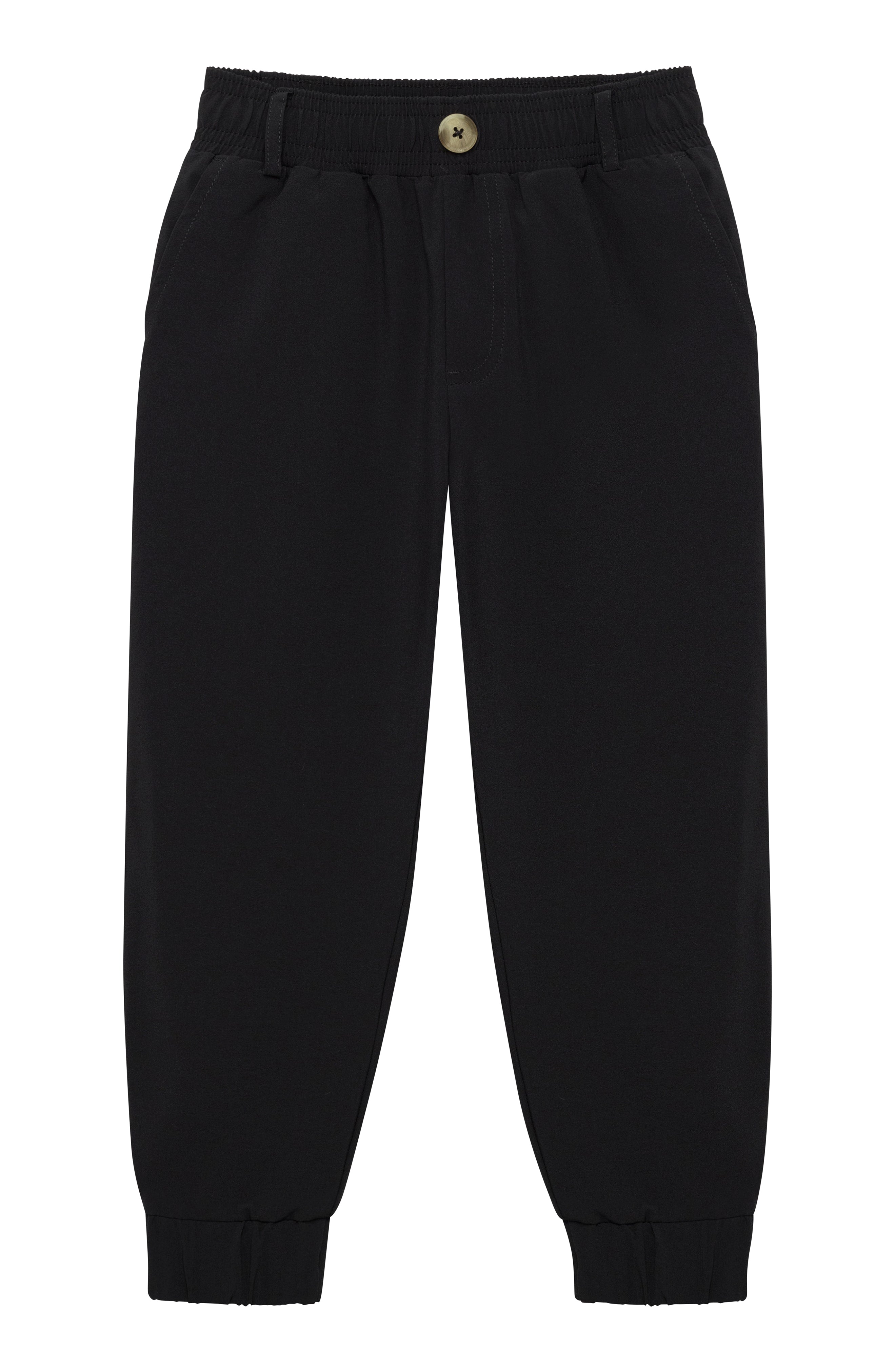our famous cut of joggers - now in our best-selling dress short fabric with belt loops and a decorative button. these pull-on joggers are perfect for the sporty boy who hates buttons and dress clothes. they are polished, yet comfortable. made to replace your son's dress pants.