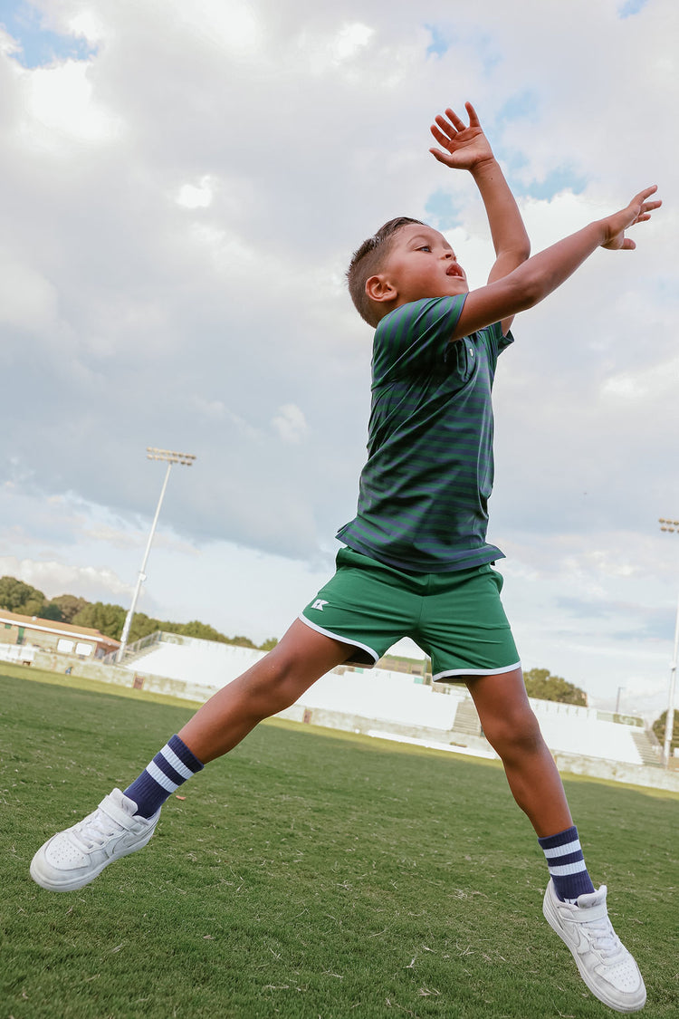 our classic design hits above the knee for a sharp modern fit that both moms and boys love. available with and without the built-in liner that can also serve as underwear which many boys enjoy. the retro version of our classic super short features a contrast piping and is perfect for boys who love to move and look cool while doing it!