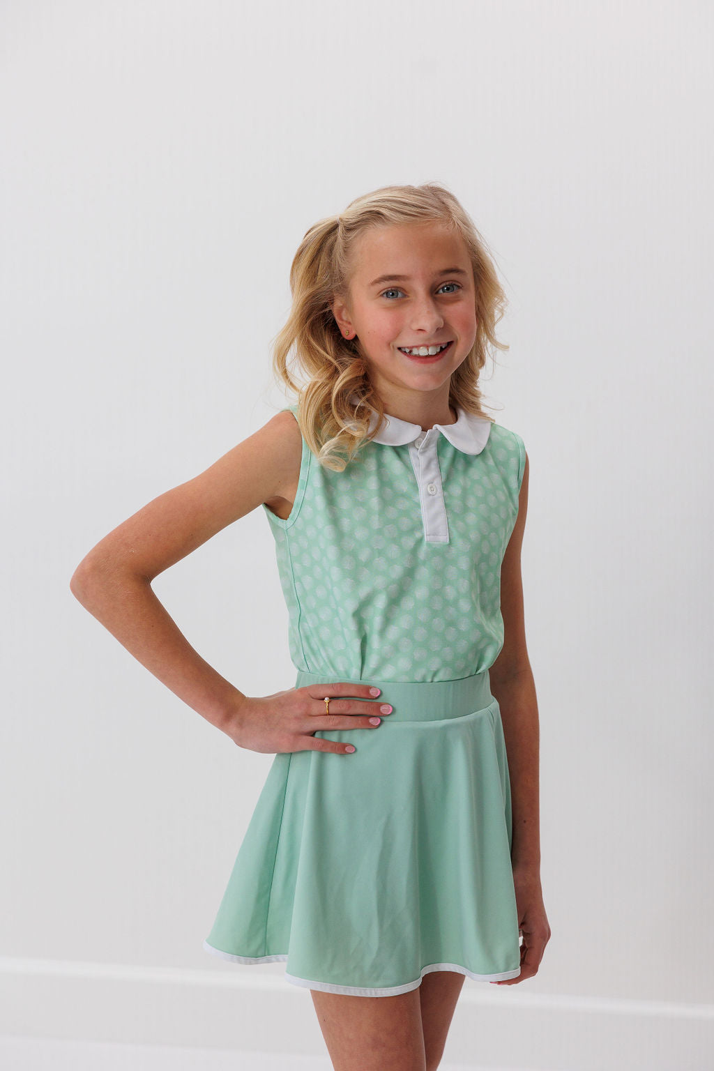 a girls tennis skirt that is made to perform! a beautiful a-line silhouette that is classic with a modern thick elastic waistband. made with our anti-odor shorts underneath complete with a pocket for a tennis ball and/or phone. the cut is exceptional!