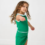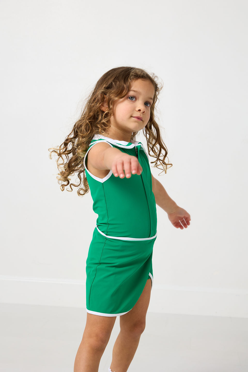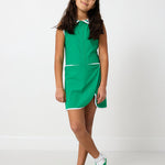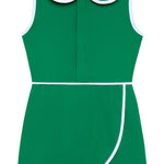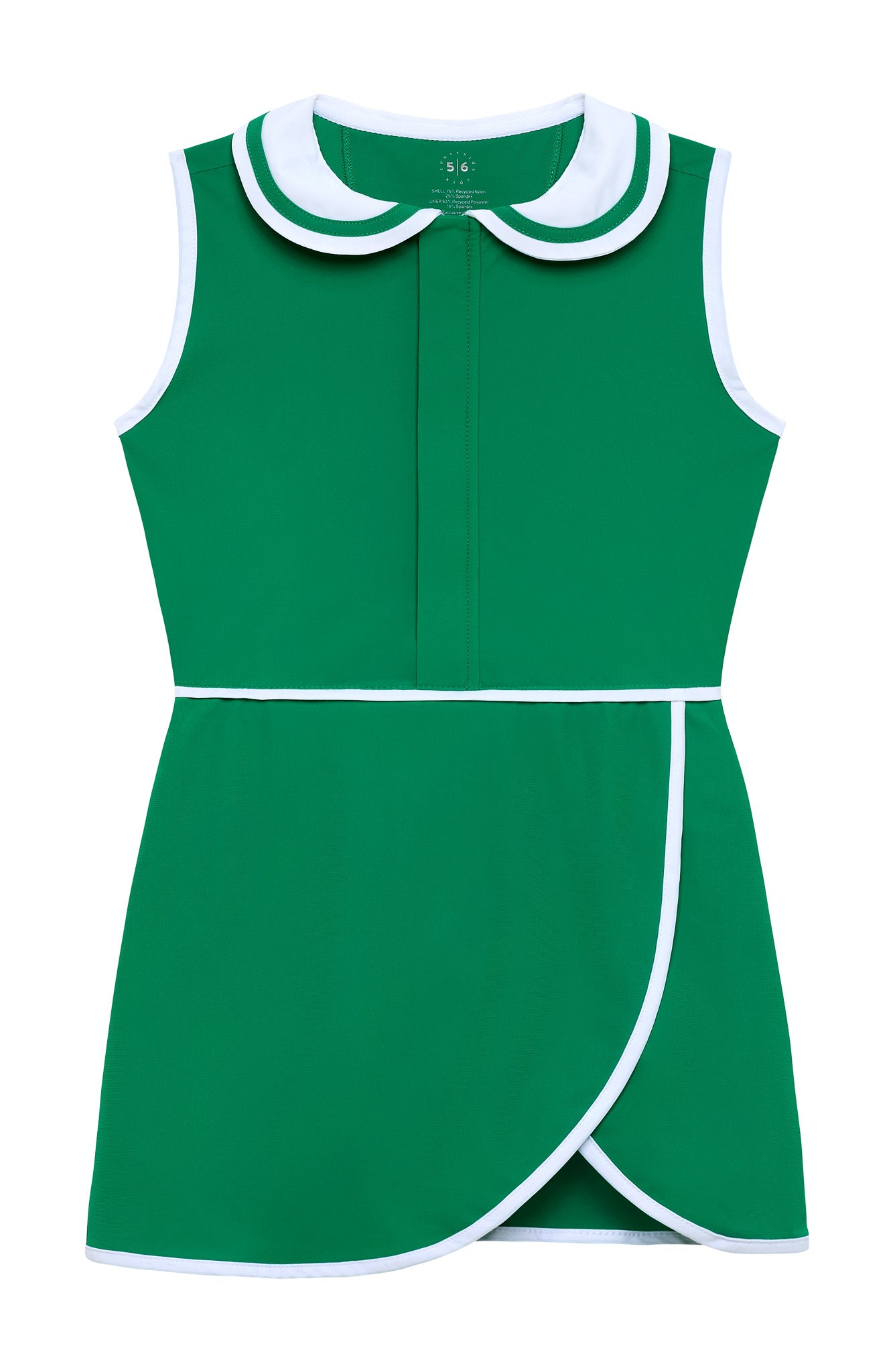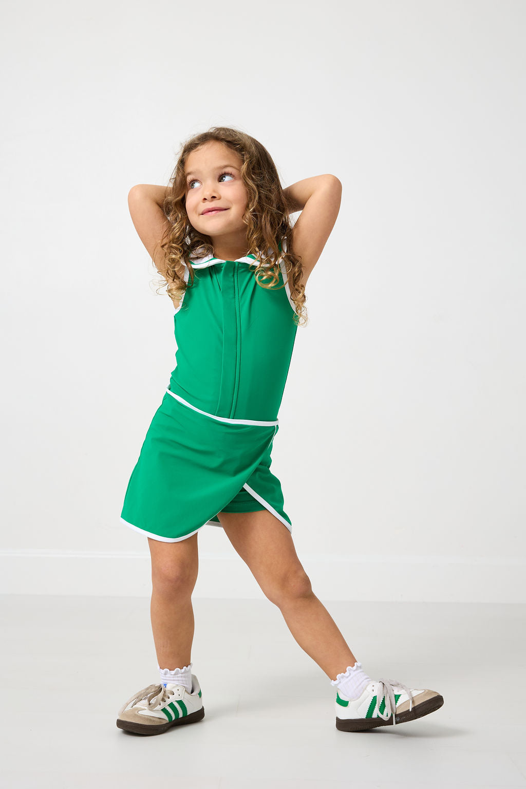 the kelly green tennis dress is where sporty meets stylish. this standout green dress features bold white contrast trim for a crisp, retro edge. the a line cut is flattering and the built in shorts give the active girl the freedom to move, stretch and shine on or off the court. a built in zipper makes it easy to get on and off.