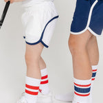 our classic design hits above the knee for a sharp modern fit that both moms and boys love. available with and without the built-in liner that can also serve as underwear which many boys enjoy. the retro version of our classic super short features a contrast piping and is perfect for boys who love to move and look cool while doing it!