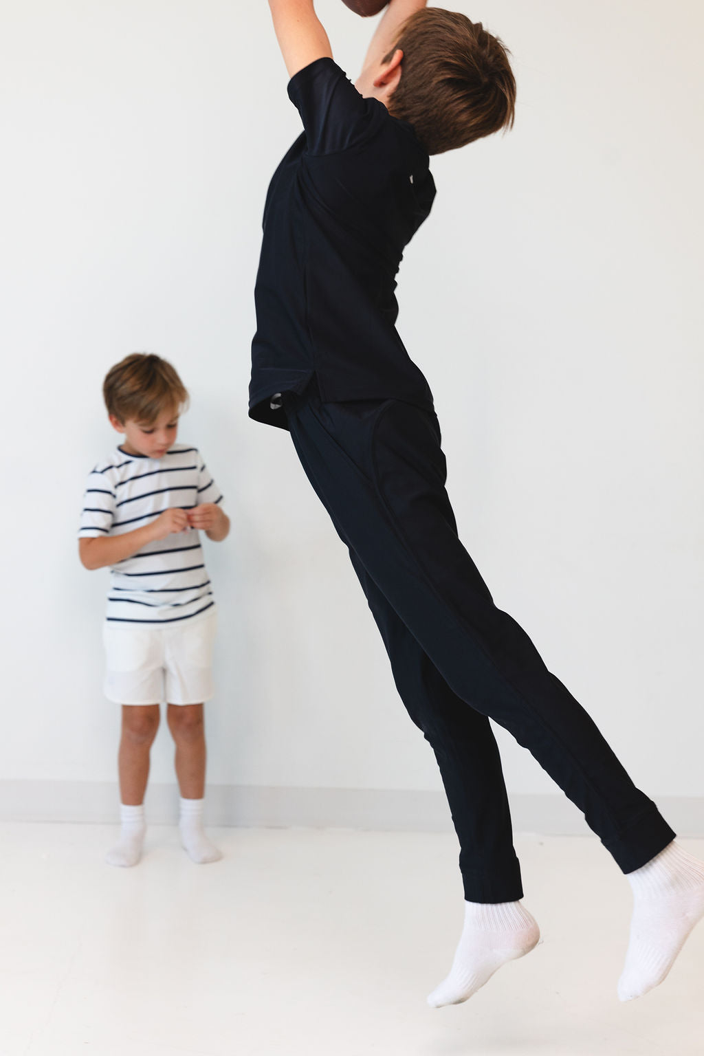 the fall/winter jogger you've been waiting for! buttery soft fabric with a european fit, they're made to hit slightly above the ankle for a slim look. these boy joggers can be dressed up or dressed down. make it an easy-to-grab-and-layer outfit by purchasing a coordinating half-zip or pullover. the jogger of your dreams that can go from school, to sports, to dressed up events! featuring a beautiful blend of recycled polyester and spandex that will stretch and move with your boys. these joggers are the MVP.
